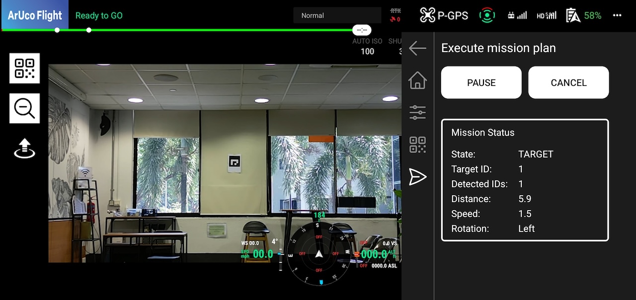 ArUco Flight is an automatic flight application for DJI drones that utilizes ArUco markers. The camera mounted on the drone recognizes ArUco markers placed within the flight area and automatically moves to the specified target marker. This application can be used in environments where GPS is not available, such as offices and factories.